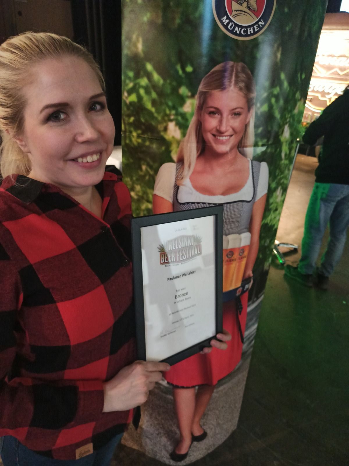 Paulinerin tuotepäälikkö Henna Parkkila ja pronssia voittanut Paulaner Weissbier 5,5%